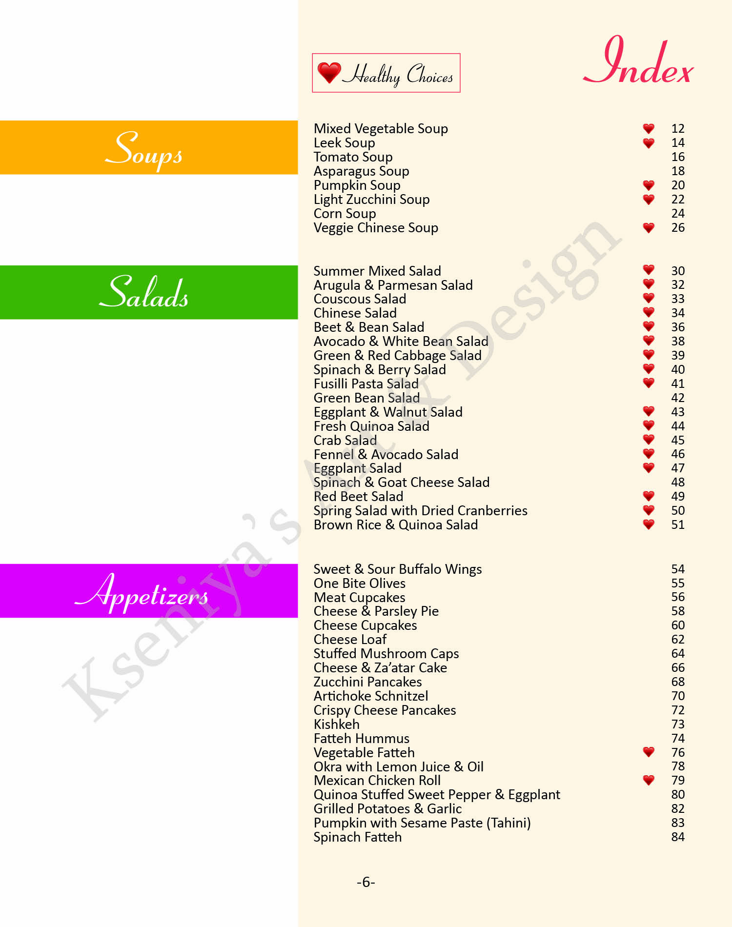 This project represents one of several books and booklets I have worked on. Modern Home Cuisine by Saheer Asfour and Hala Malhas is a project I am especially proud of, for which I designed and laid out the interior pages. Image preparation was completed in Adobe Photoshop, and the final book setup was done in Adobe InDesign.